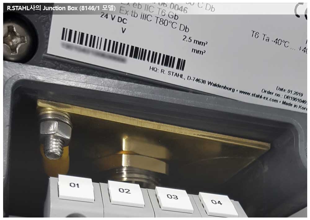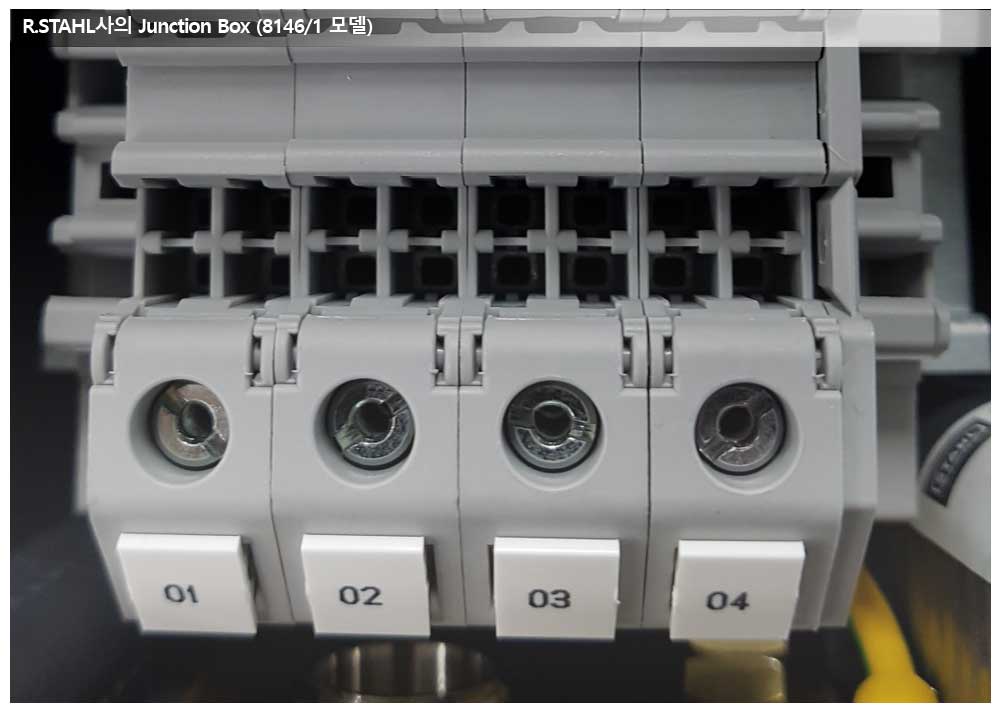 Junction Box 는 현장상황에 최적화된 ring type terminal block(Phoenix contact사의 RT 모델)을 사용하고 있습니다.